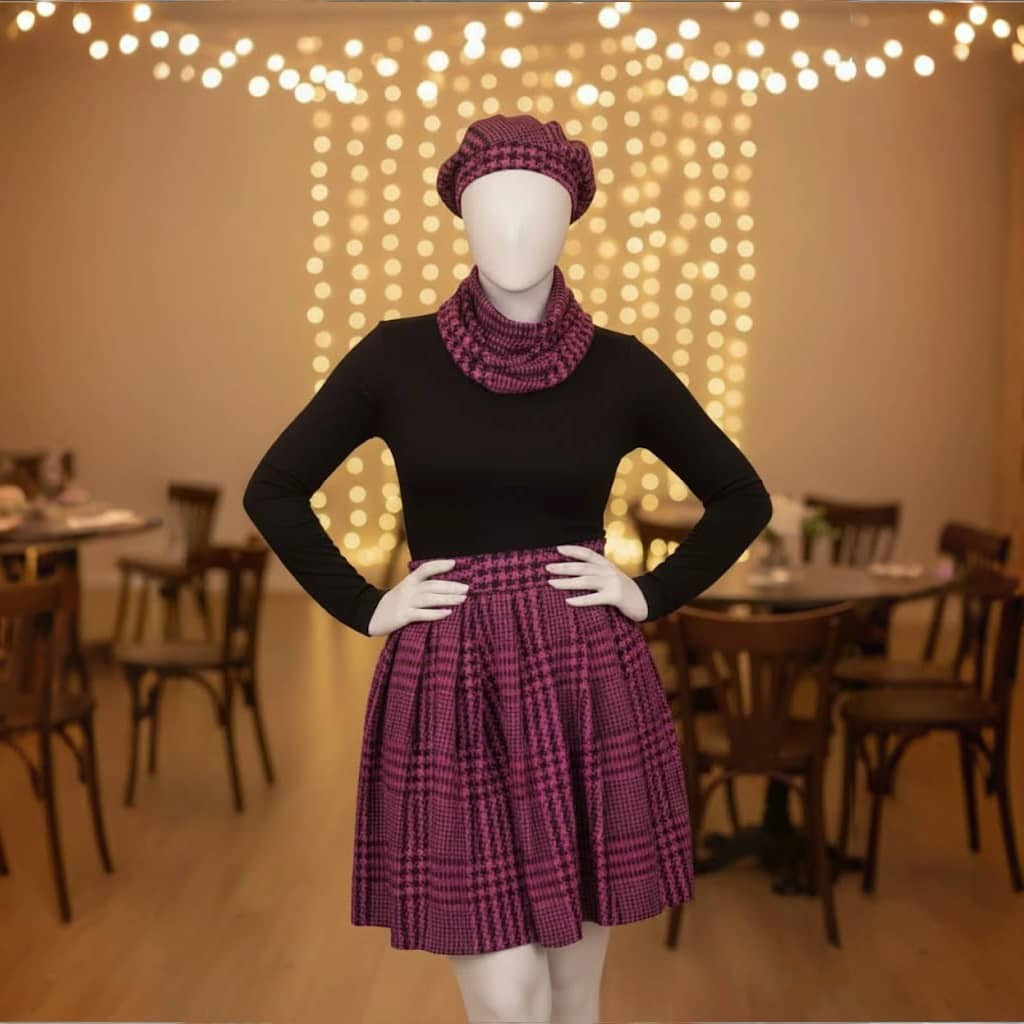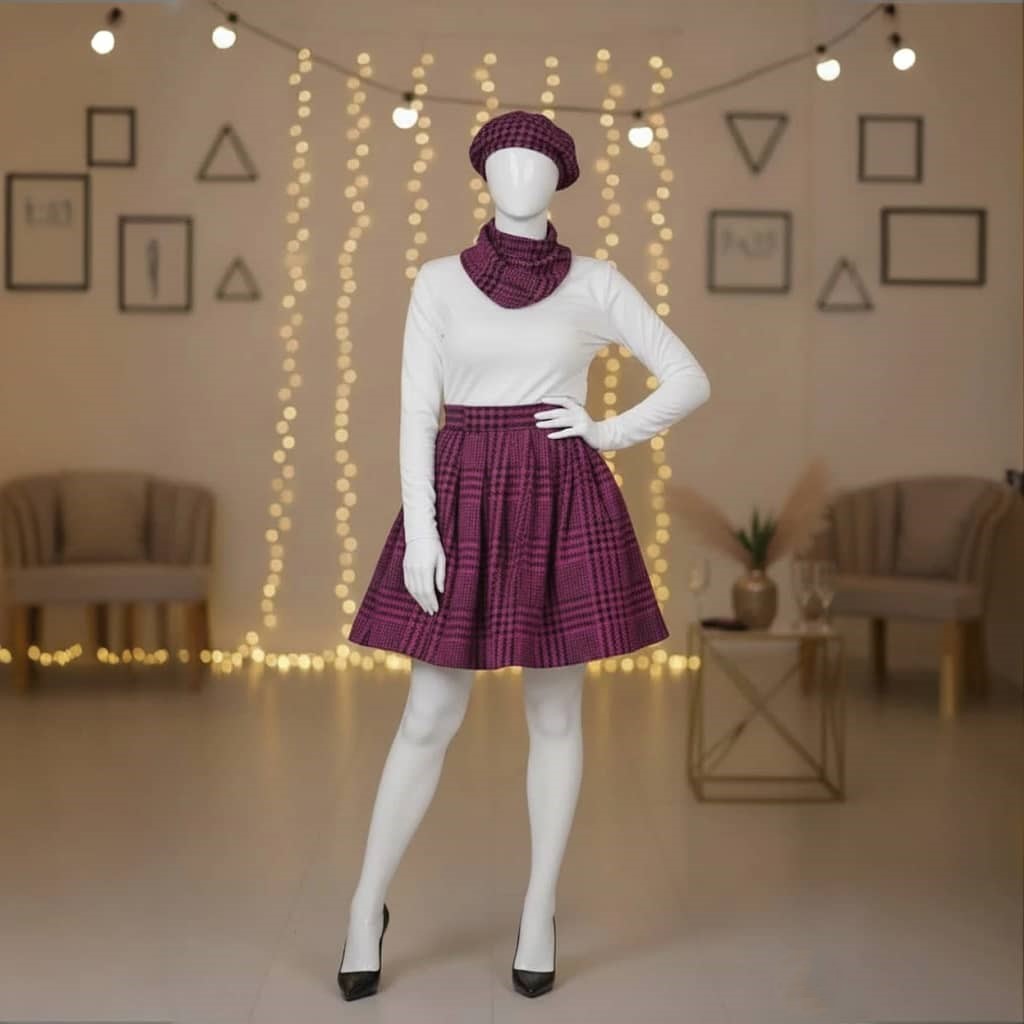 -سكارف وطاقية وتنورة جوخ مع بلوزة بلوزة باللون الأبيض أو الأسود