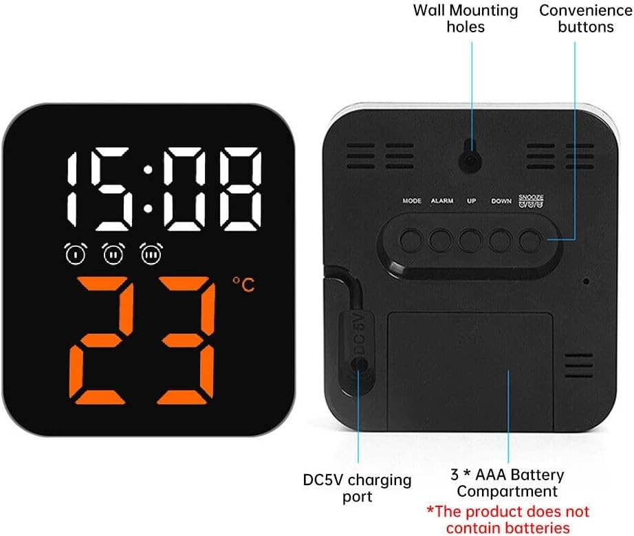 ⏰توفير الطاقة: تستهلك ساعة ومقياس حرارة LED GH8015 طاقة قليلة، فلا داعي للقلق بشأن فاتورة الكهرباء. عند تشغيلها بالبطارية، تنتقل الساعة إلى وضع توفير الطاقة بعد 16 ثانية وتُطفأ الشاشة.