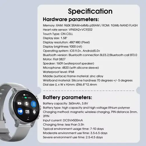 ساعة غنية بالميزات، مزودة بشاشة AMOLED مقاس 1.58 بوصة، وميزة الاتصال عبر البلوتوث، وتتبع شامل للصحة (معدل ضربات القلب، ونسبة تشبع الأكسجين في الدم، والنوم، وأكثر من 100 وضع رياضي)، وتوفر عمر بطارية يتراوح بين 7 و14 يومًا، ومقاومة للماء بمعيار IP68، وذاكرة وصول عشوائي (RAM) سعة 1 جيجابايت لأداء سلس، ومساعد صوتي مدمج، تعمل بتطبيق HaWoFit لتوفير تجربة لياقة بدنية واتصال شاملة.