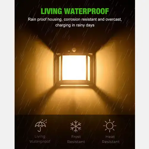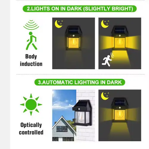 ارتقِ بأجواء مساحتك الخارجية مع مصباح الحائط الخارجي المقاوم للماء والمزود بمستشعر حركة يعمل بالطاقة الشمسية (مصباح حائط شمسي من التنجستن). يتميز هذا المصباح الشمسي بثلاثة أوضاع إضاءة: 1- وضع استشعار الحركة، 2- وضع استشعار الحركة مع إضاءة خافتة، 3- وضع الإضاءة المستمرة (بدون حركة)، بمدى استشعار يتراوح بين 5 و8 أمتار. استمتع براحة الشحن اللاسلكي، حيث يُشحن المصباح بسهولة خلال النهار ويضيء تلقائيًا في الليل. يُمكن تثبيته على الحائط لتوفير خيارات متعددة، ويجمع هذا المصباح بين التصميم الأنيق والوظائف الذكية، مع مستشعر حركة لتعزيز الأمان. أنِر مساحاتك الخارجية بكل سهولة مع حل الإضاءة الفعال هذا. ودّع الأسلاك المتشابكة والتركيبات المعقدة، فهذا المصباح الشمسي يعمل لاسلكيًا، موفرًا إضاءة مريحة لمساحاتك الخارجية. استمتع بالشحن التلقائي خلال النهار حيث تستغل اللوحة الشمسية طاقة الشمس، واستمتع بتشغيله بدون استخدام اليدين ليلًا لإضاءة خارجية متواصلة.