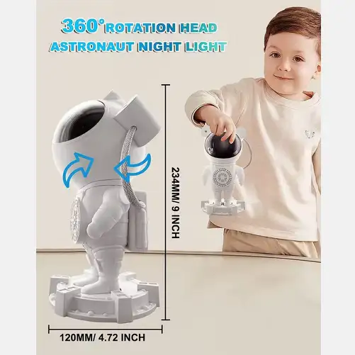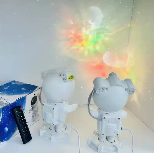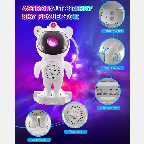 جهاز عرض على شكل رائد فضاء يُضيء بتأثيرات المجرات والسدم. مزود بمكبر صوت مدمج يتصل بهاتفك عبر البلوتوث.