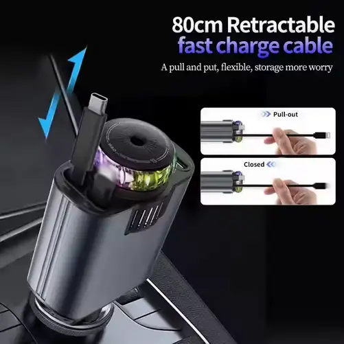 توفير المساحة والتنظيم: يساعدك شاحن السيارة سريع الشحن في الحفاظ على ترتيب وتنظيم مقصورة سيارتك بفضل تصميمه المريح بكابل قابل للسحب بطول 31.5 بوصة. يمكنك مدّ الكابل وسحبه بسهولة للتخلص من الأسلاك المتشابكة والحفاظ على مساحة نظيفة.