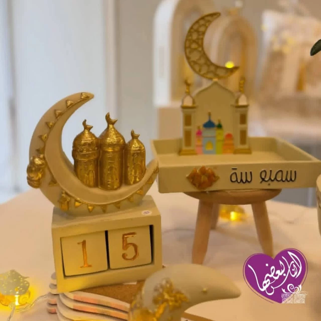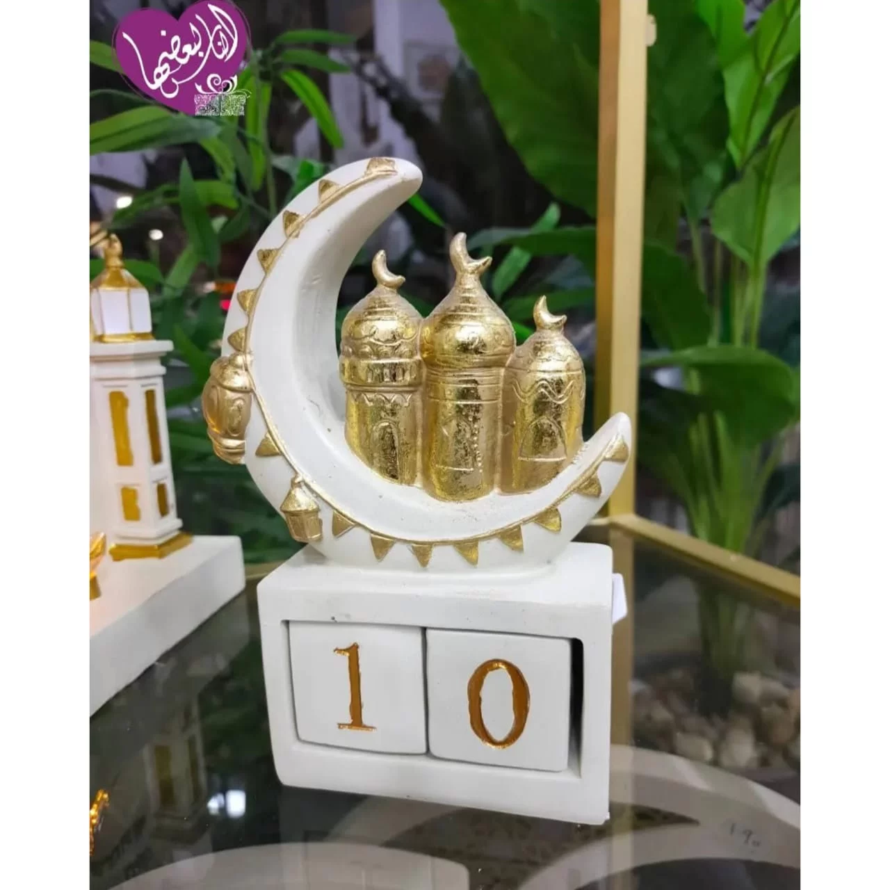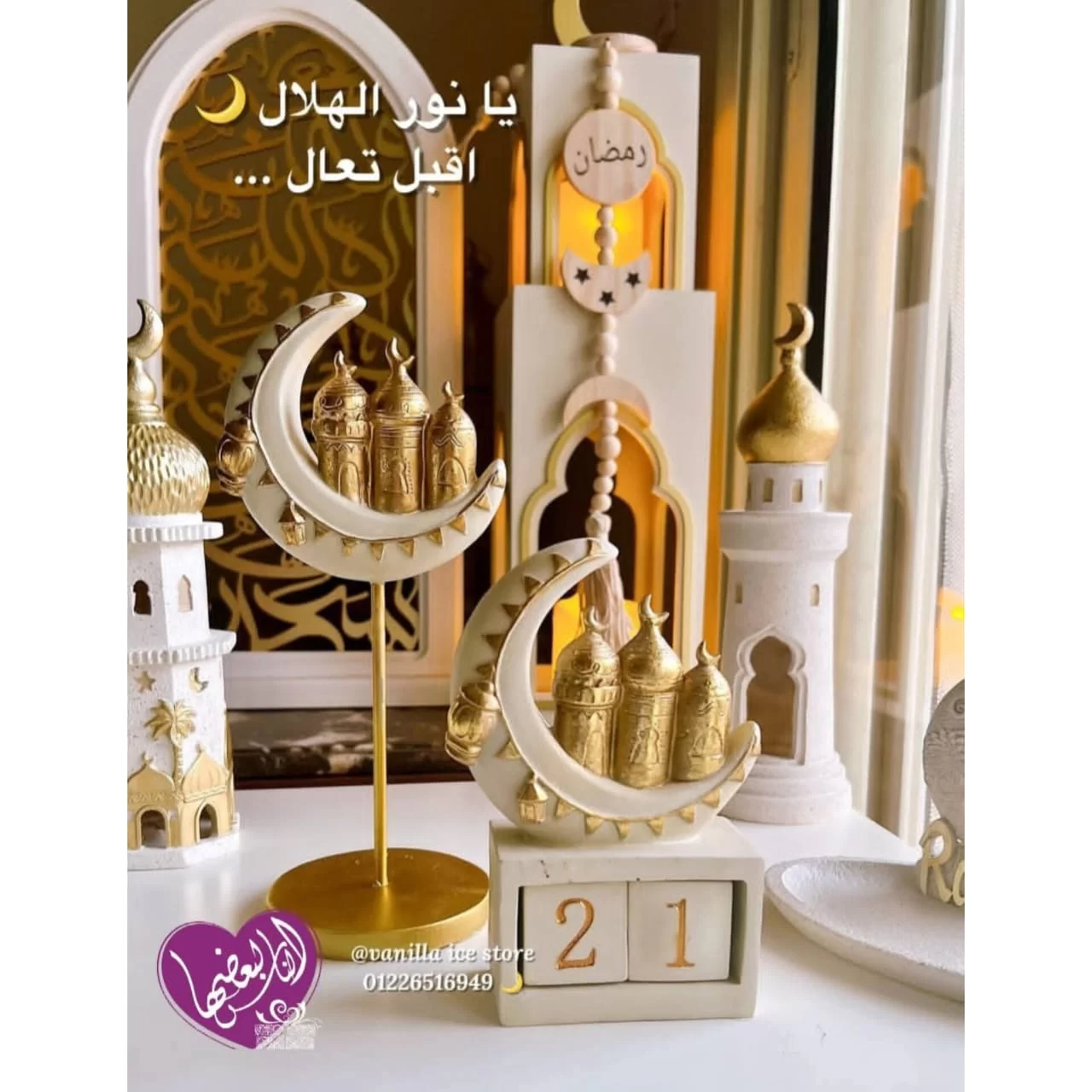 -تتضمن الزينة مجسمًا لهلال أبيض وذهبي يعلوه مجسمات صغيرة لمآذن مساجد ذهبية، بالإضافة إلى مكعبات بيضاء مرقمة بأرقام ذهبية (2، 3، 1) يمكن استخدامها كتقويم للعد التنازلي لأيام الشهر الفضيل