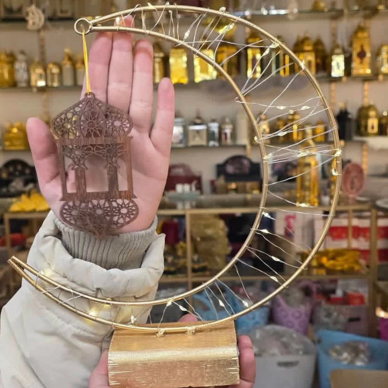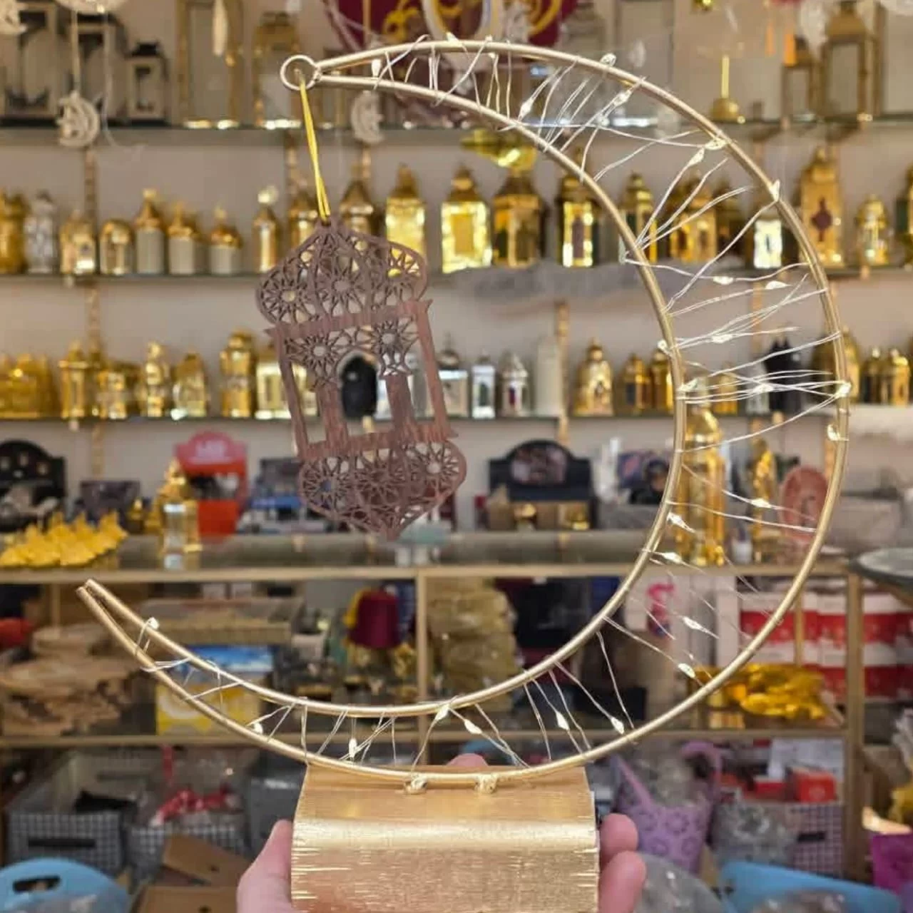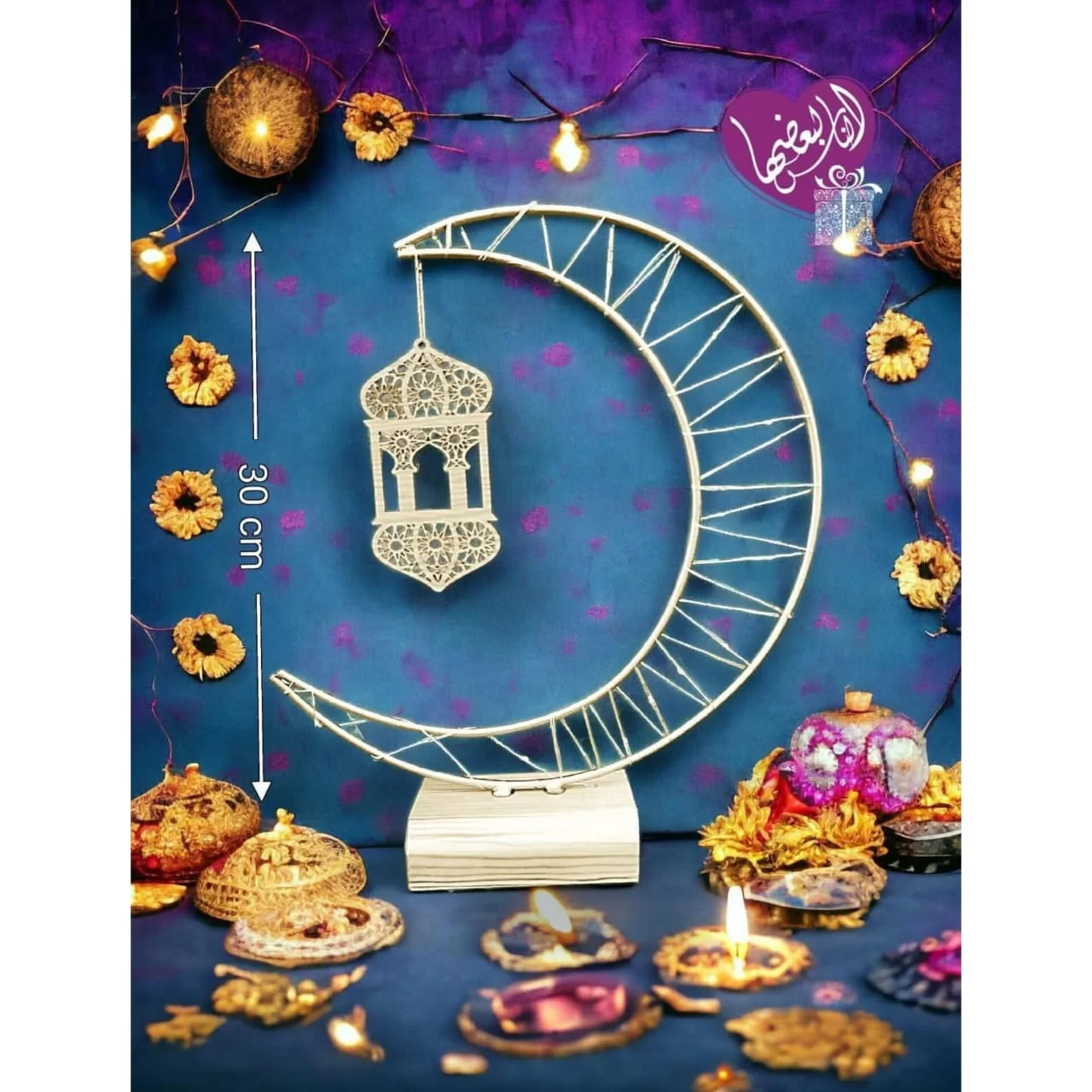 -هلال مضيء معدن بقاعدة خشبية