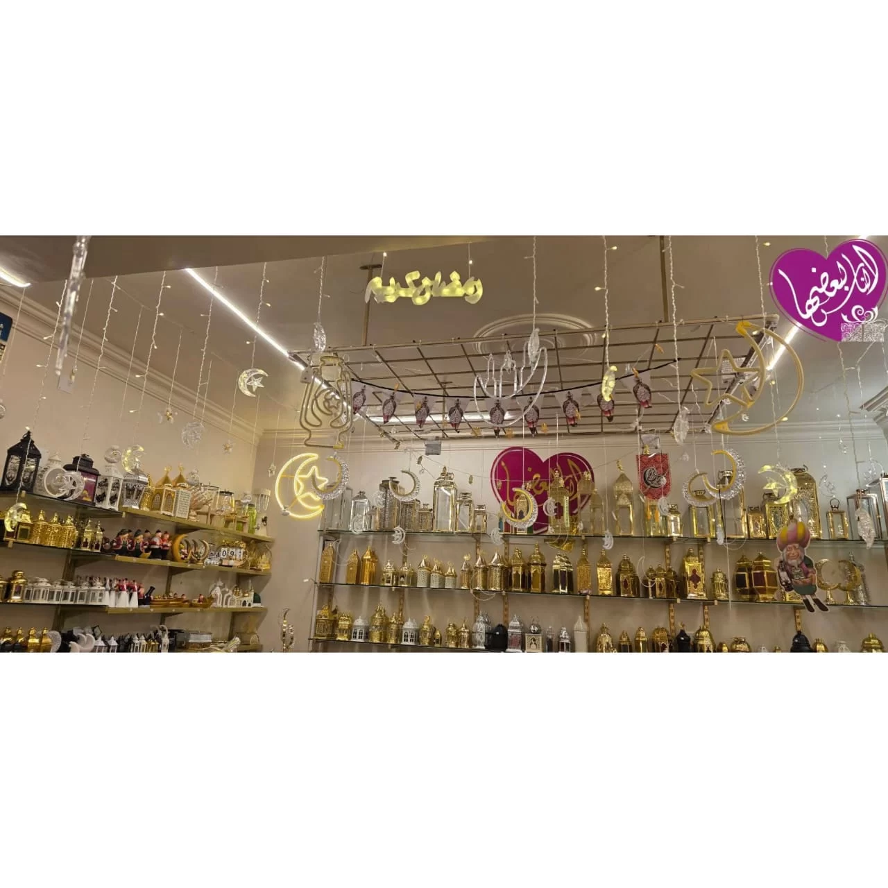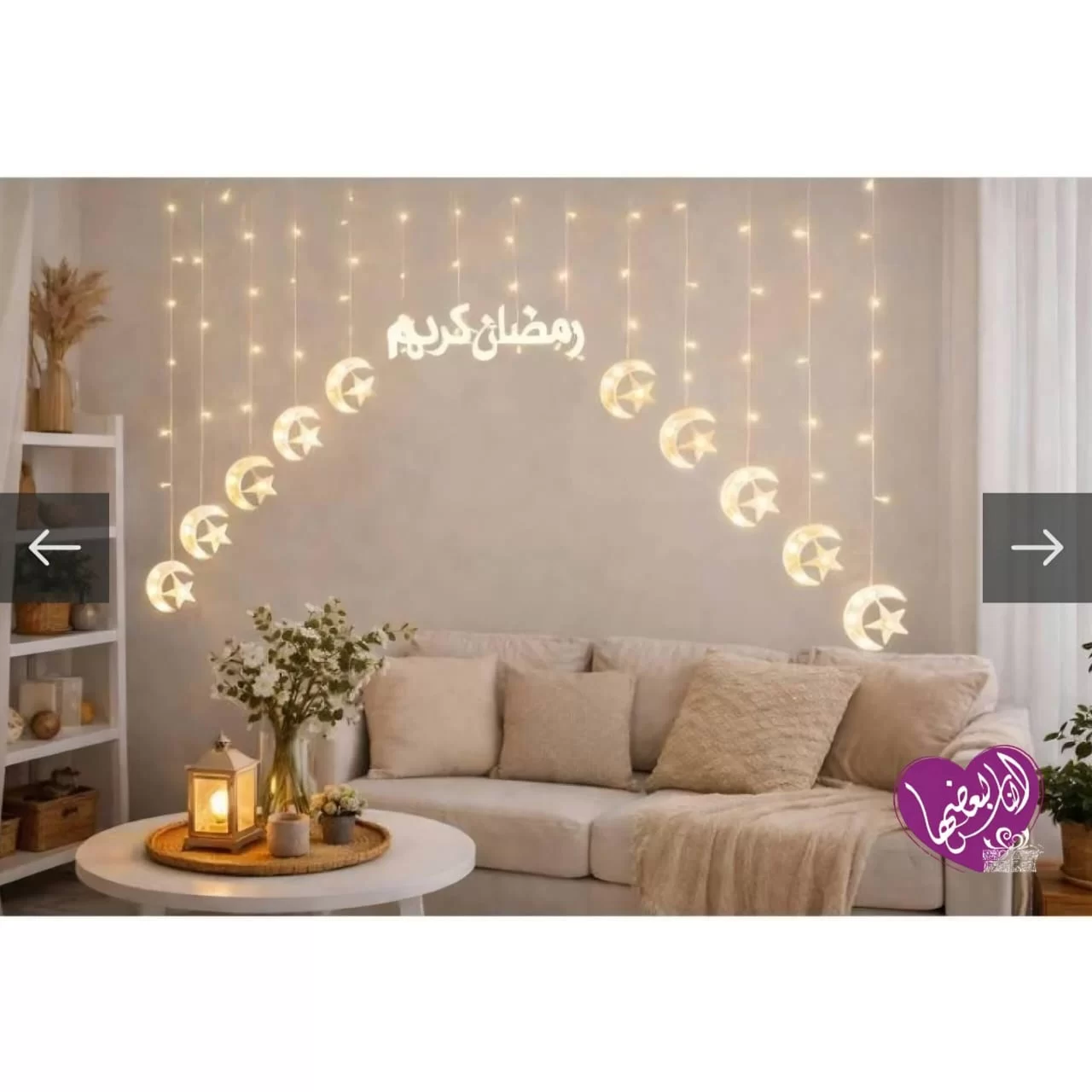 -حبل إضاءة رمضاني بتصميم شلال هرمي متدلي بتشكيلة من الأهلة والنجوم، يتوسطها عبارة “رمضان كريم”