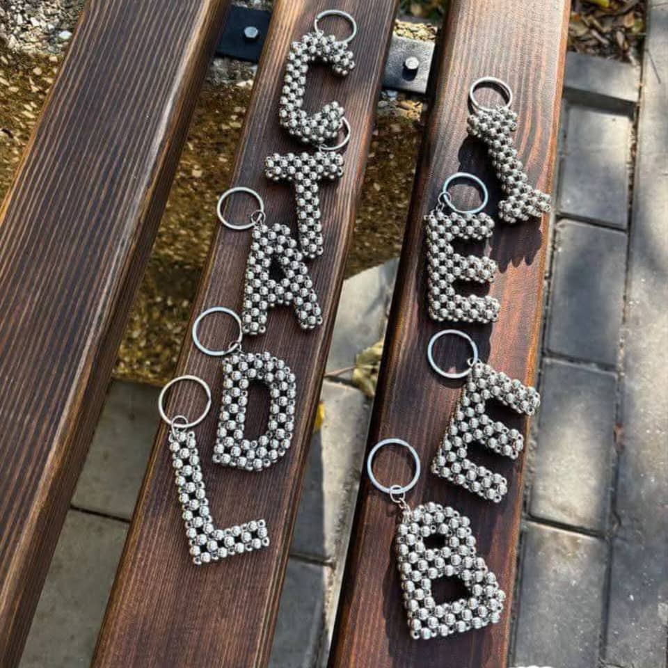-بورتكليه مفاتيح على شكل حروف مصنوعة من الخرز الفضي.