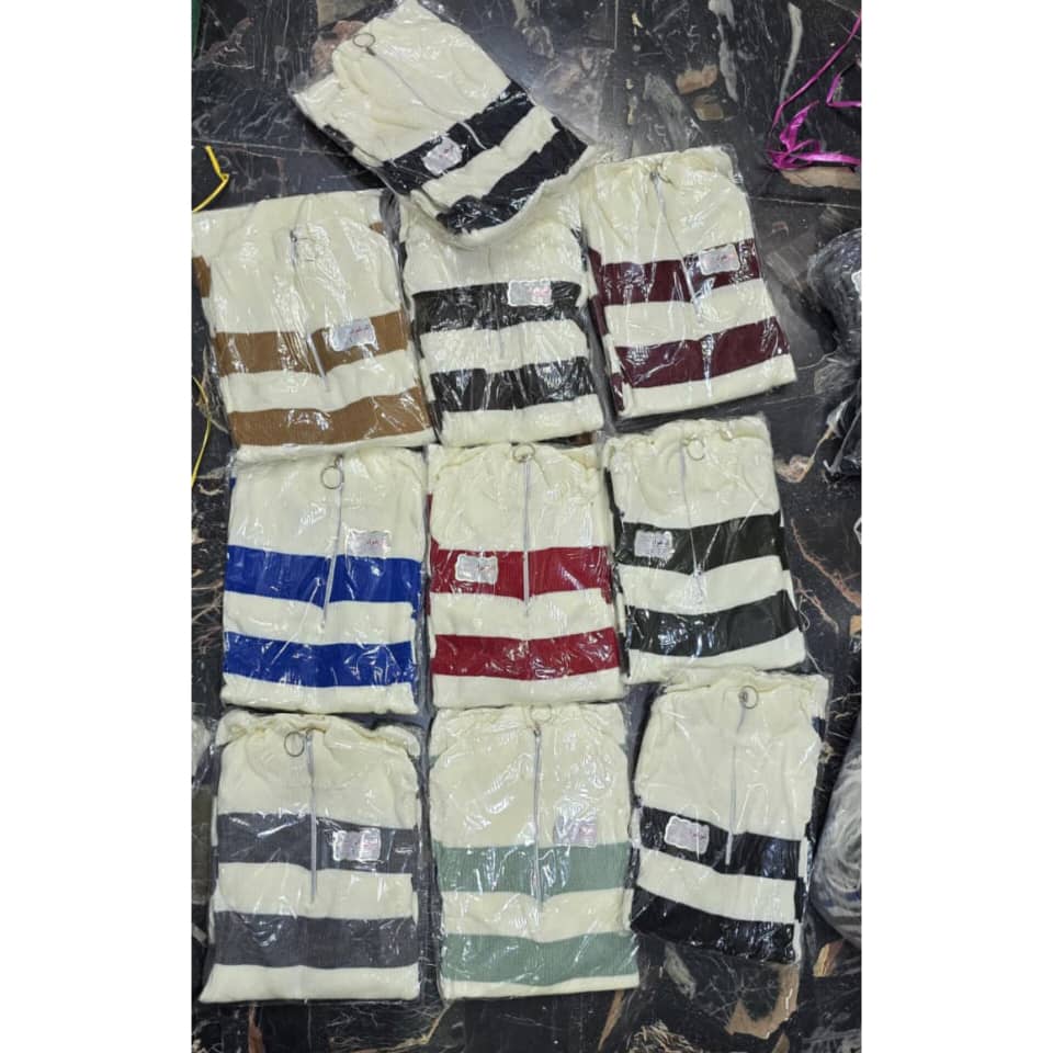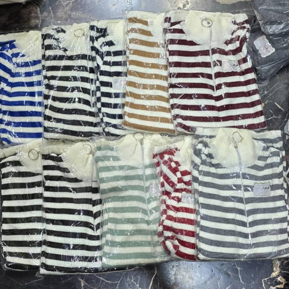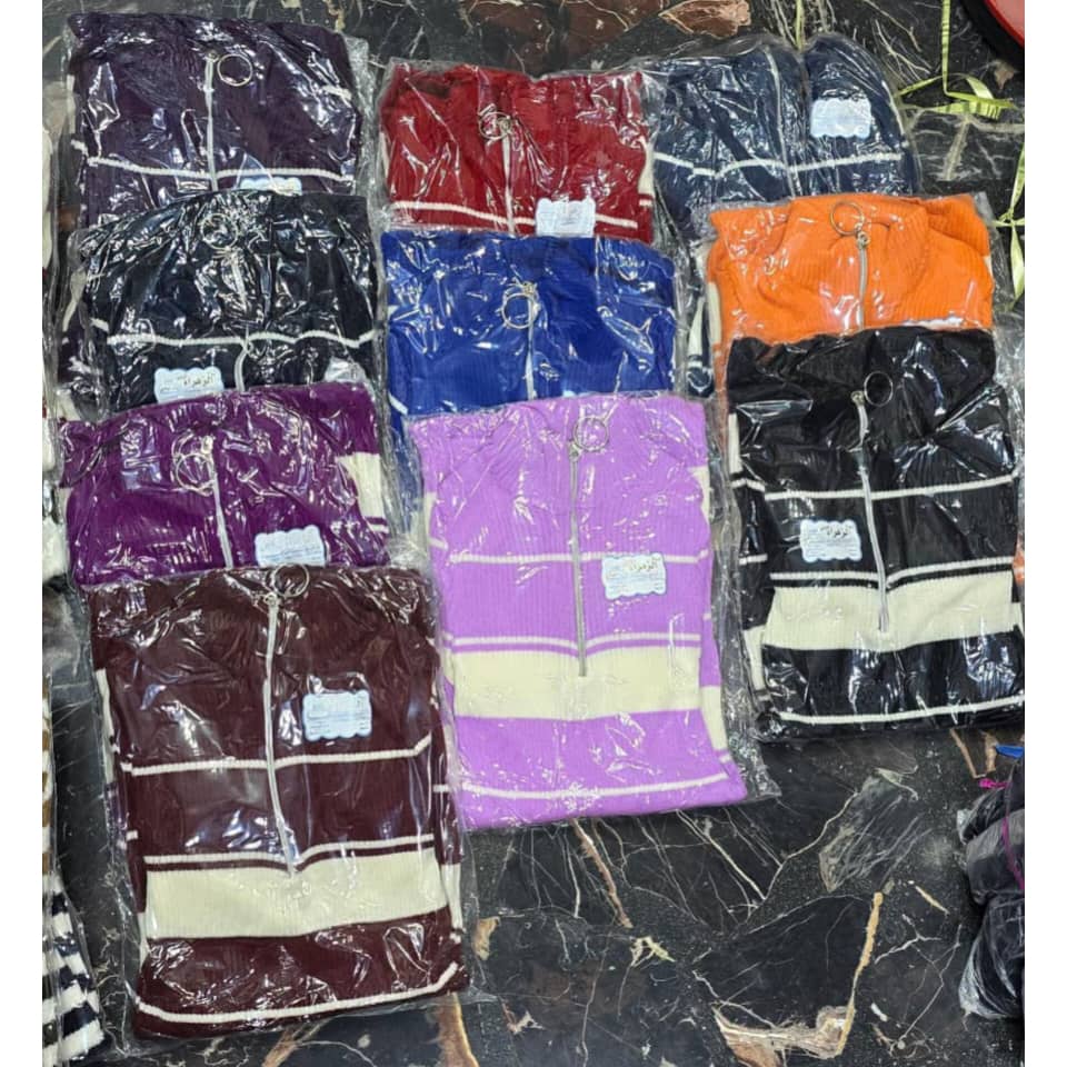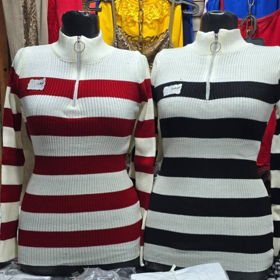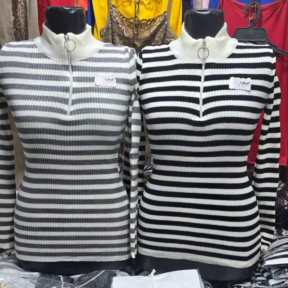 -بلوزة نسائية مخططة بياقة عالية وسحاب أمامي قصير
