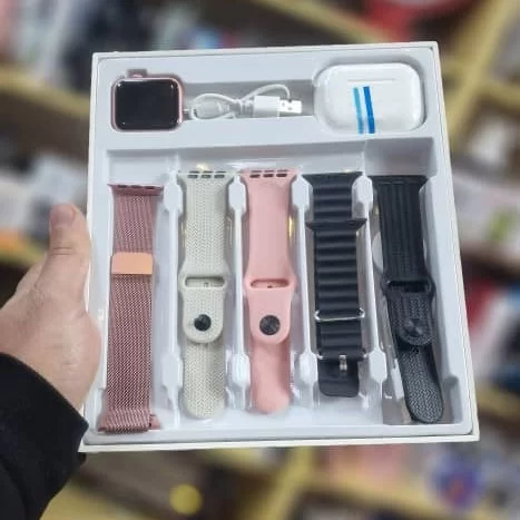 محتويات العلبة: ساعة ذكية + سماعات AirPods + 5 أحزمة + شاحن + دليل المستخدم