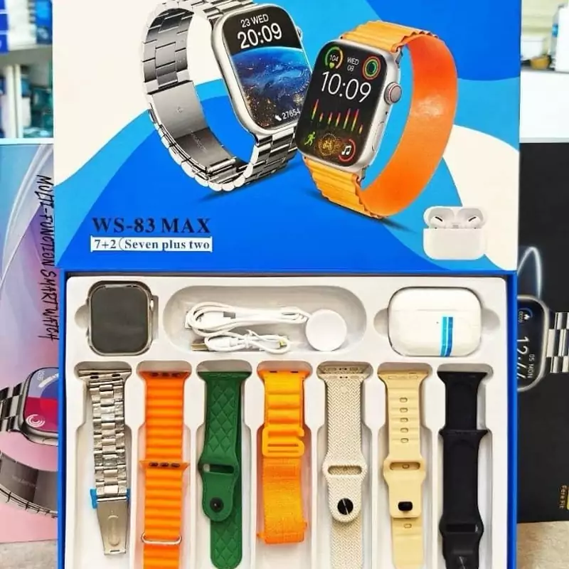 شاشة عرض كاملة عالية الجودة. 7 أحزمة متعددة الاستخدامات وقابلة للتبديل. مزودة بسماعات AirPods مشابهة لسماعات Apple. تدعم نظامي Android وiOS. إمكانية إجراء واستقبال المكالمات. عرض رسائل وسائل التواصل الاجتماعي. مستشعرات صحية (معدل ضربات القلب، ضغط الدم، نسبة الأكسجين في الدم، مراقبة النوم). ميزات رياضية (عداد الخطوات، عداد السعرات الحرارية). مقاومة للرذاذ بمعيار IP68. شاحن لاسلكي سريع. دعم تغيير واجهات الساعة. التحكم في الموسيقى. آلة حاسبة، عرض حالة الطقس، تقويم، تنبيهات. حجم مناسب (45 مم). بطارية تدوم طويلاً. تقويم مدمج. إمكانية ضبط التنبيهات. عرض حالة الطقس. إمكانية التقاط صور بكاميرا الهاتف. شاشة لمس حساسة وسلسة. متوافقة مع Bluetooth 5.0 لاتصال سريع ومستقر. إمكانية عرض الإشعارات.
